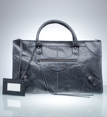 Soft vintage crafted lambskin • aged brass hardware • top zip closure • hand stitched handles 5.1'' drop • front zip pocket • leather strings on zips • leather framed hand mirror • fine textile lining • interior zip pocket with Balenciaga engraved plaque • 18.1'' x 11.8'' x 6.3'' • lightweight 1.8 lbs • made in Italy.